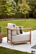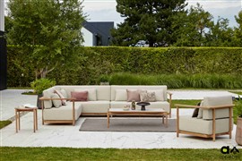 Kolekcia vonkajšieho sedacieho nábytku a stolíkov z teaku.