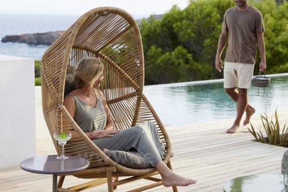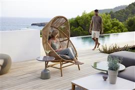 Dizajnové relaxačné kreslá Hive od Cane-line. Nízke aj hojdacie kreslá z umelého ratanu.