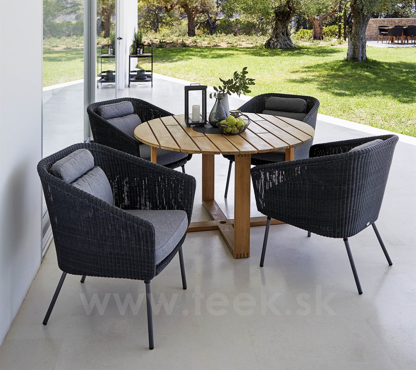 Komfortní venkovní jídelní nábytek Mega značky Cane-line. Lze kombinovat s sedacím Mega Lounge nebo relaxačním Mega Relax nábytkem ze stejné kolekce.