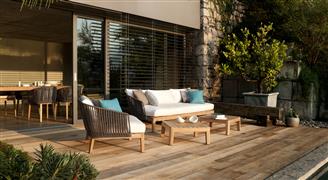 Venkovní 2-místná pohovka/sofa Mood značky Tribu s rámem z teakového dřeva a se širokým lankovým výpletem.