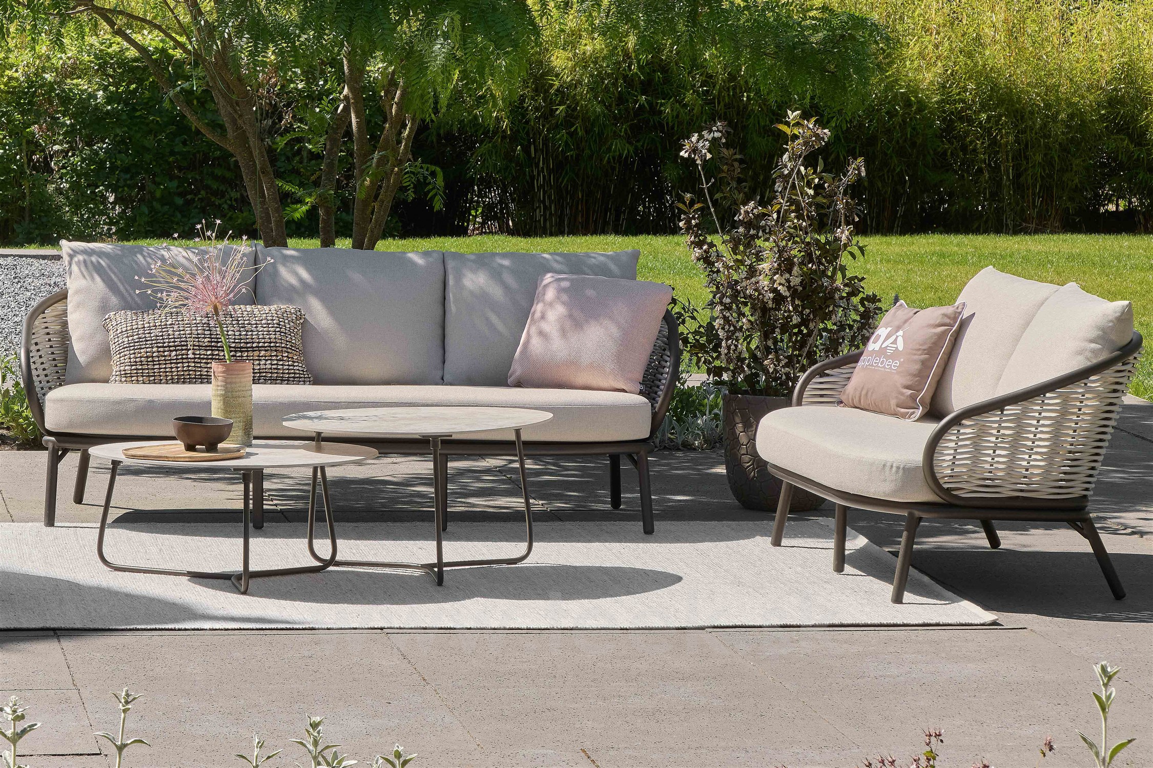 2-miestna pohovka Pine Key, Apple Bee, 145x83,5x79 cm, rám hliník Bronze (bronzová), výplet umelý ratan Oyster, sedáky vonkajšia látka Natur-CN