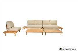 3-seater section with a left-side side table Sling, Apple Bee, 242x85x67 cm, natural teak frame, Ecru webbing weave, seat cushions in Cotton Flower outdoor fabric