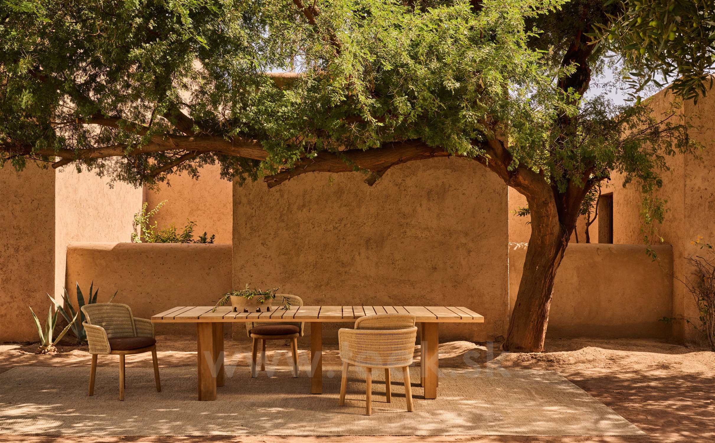 The dining table has a frame and tabletop made of high-quality teak wood.