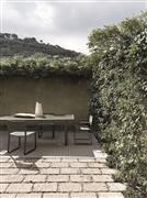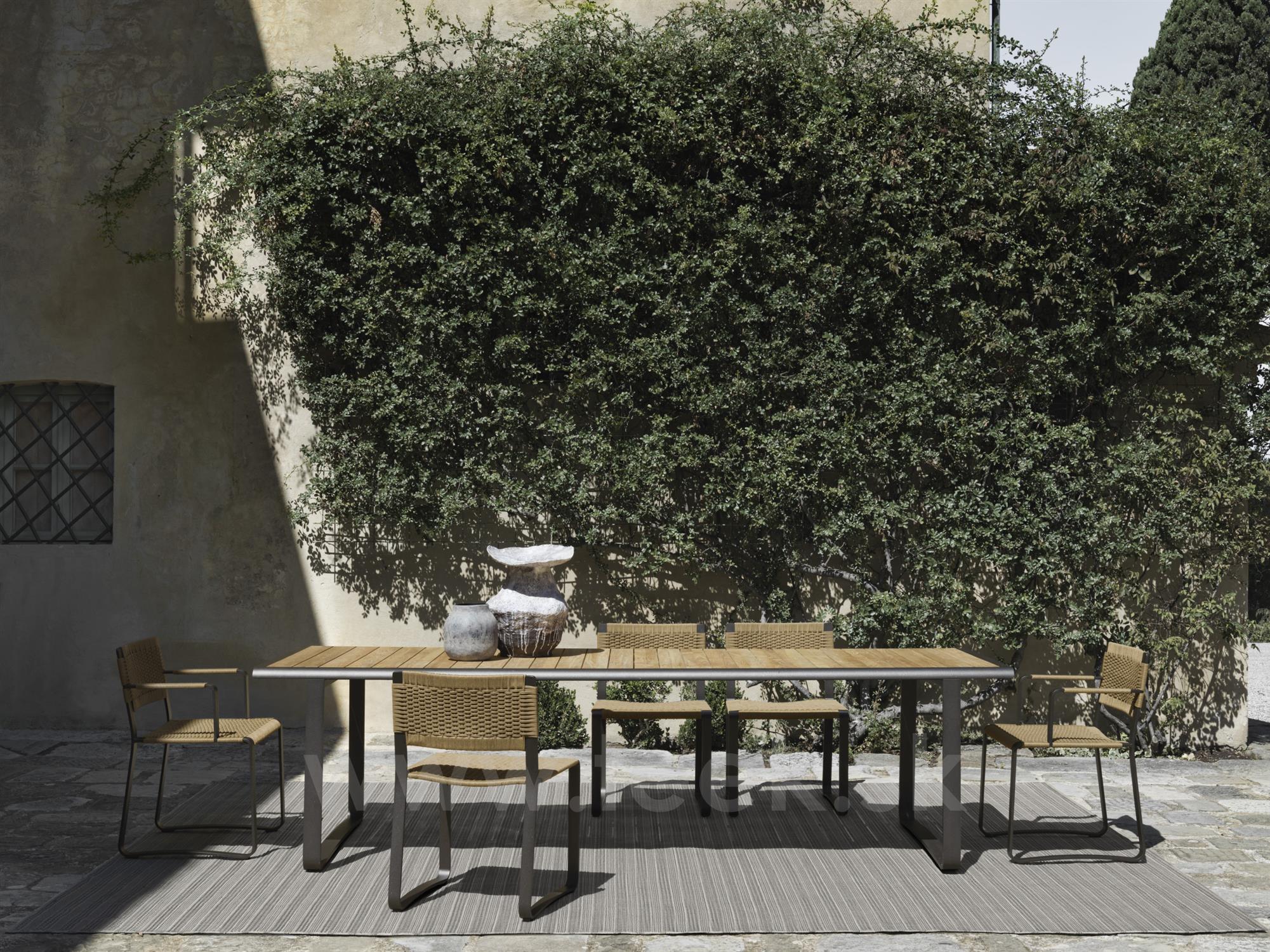 Vonkajší jedálenský stôl s lamelovou doskou na odvádzanie vody, vhodný pre 6 alebo 8 osôb. Kombinuje starostlivo kalibrované proporcie, dizajn bez ostrých hrán a motív patinovaného hliníka typický pre kolekciu Timeout. Doska stola je k dispozícii v dvoch verziách: masívne teakové drevo alebo lávový kameň (antracitová, olivovo zelená, púštna žltá).