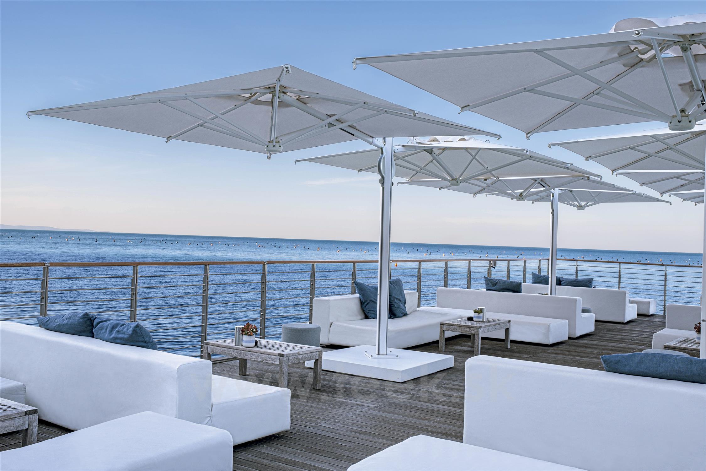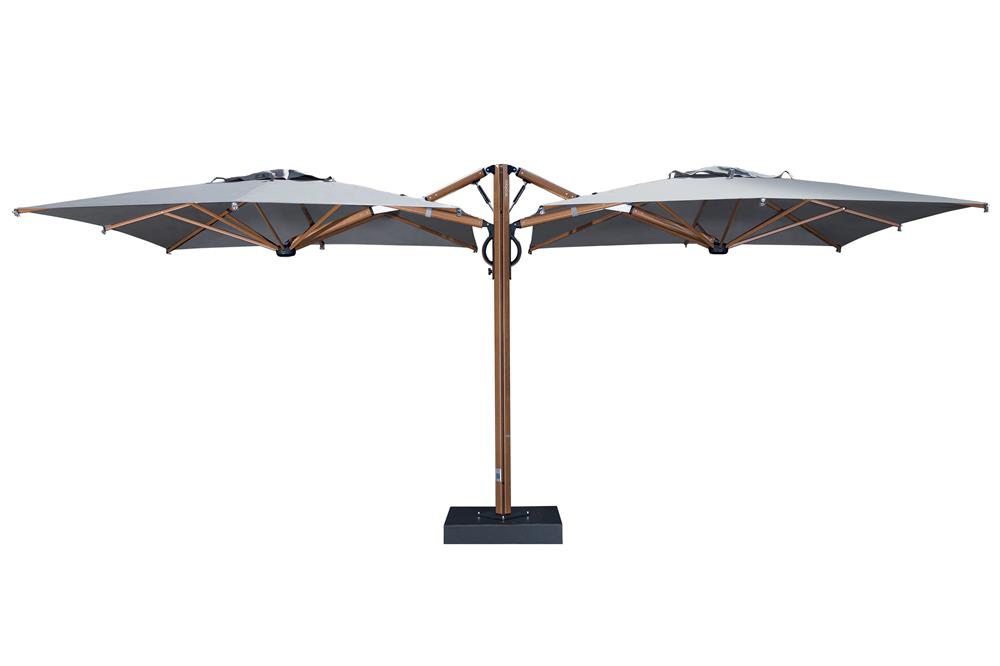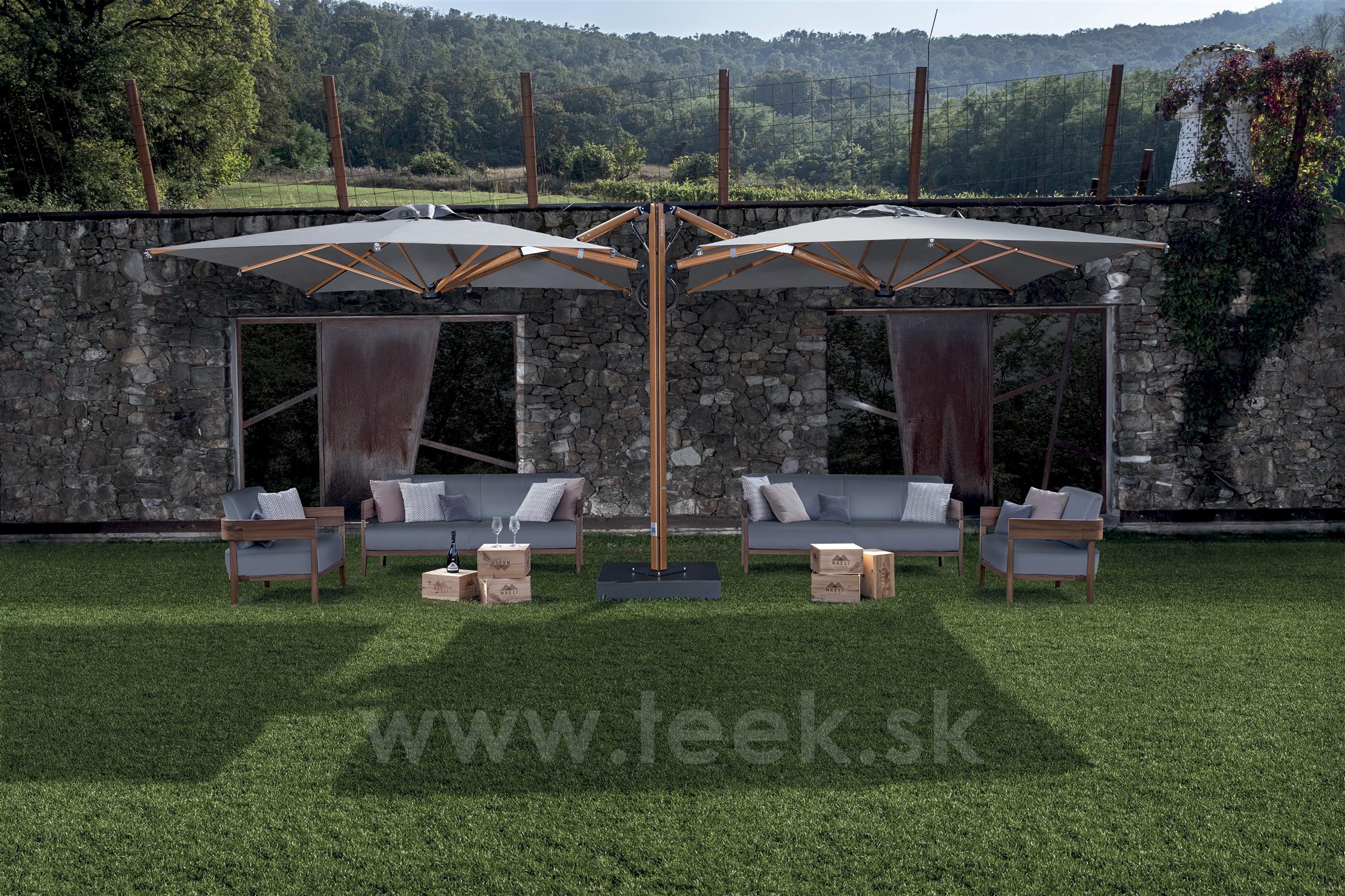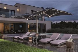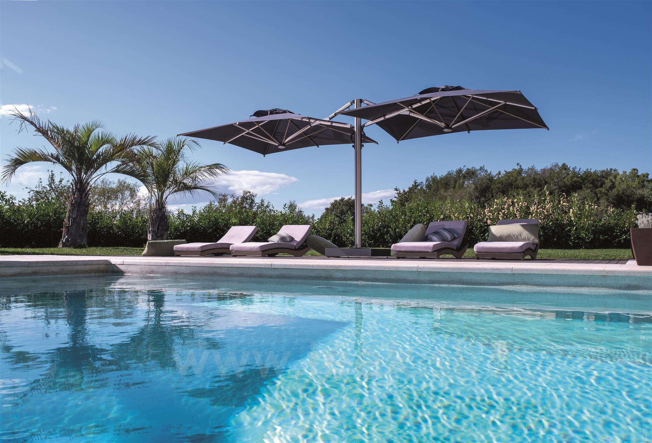 Vývoj samostatného slnečníka Astro s inovatívnym systémom otvárania a zatvárania s plynovou pružinou. Výsuvná konštrukcia umožňuje otváranie a zatváranie nad stolmi a stoličkami bez nutnosti premiestňovať nábytok. Vhodný do všetkých prostredí a odporúča sa najmä na komerčné použitie (bary, reštaurácie, hotely a terasy). Hliníkový rám. Pevná konštrukcia pozostávajúca z dvoch slnečníkov ukotvených na jednej spoločnej podpere a umiestnených symetricky.