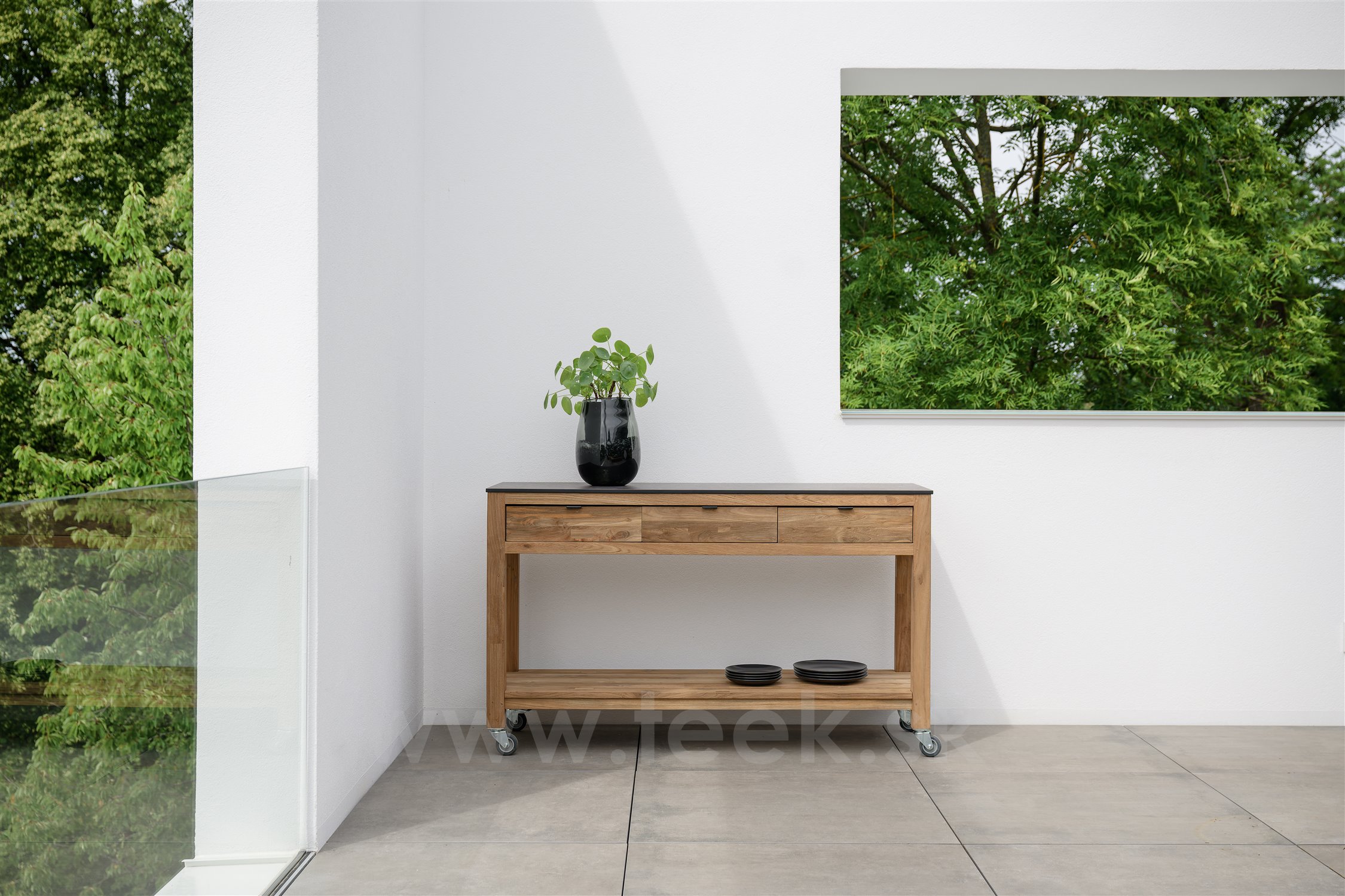 Praktické servírovacie vozíky z teakového dreva v rôznych veľkostiach.