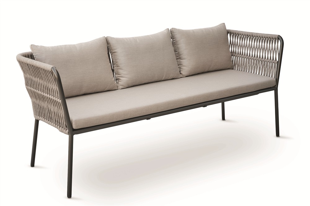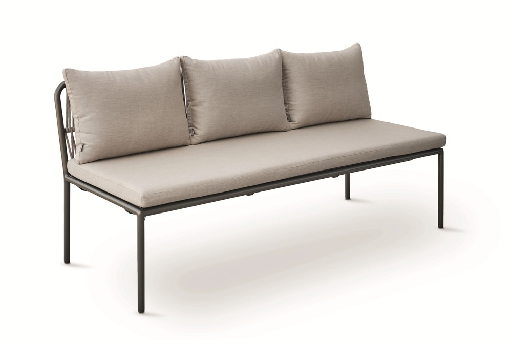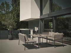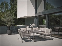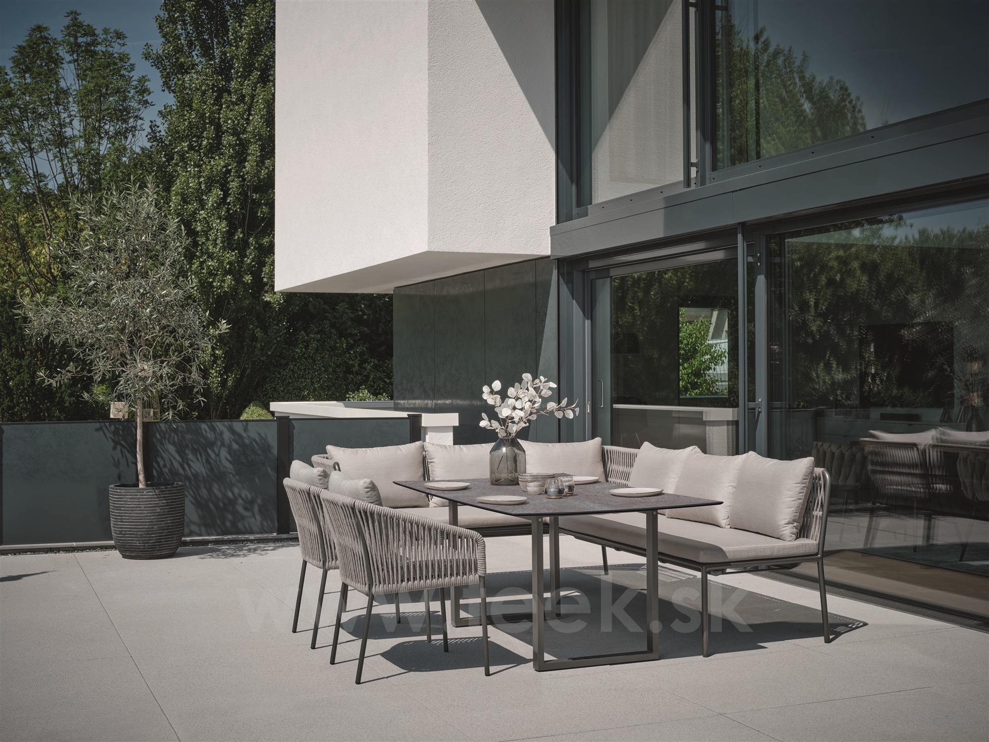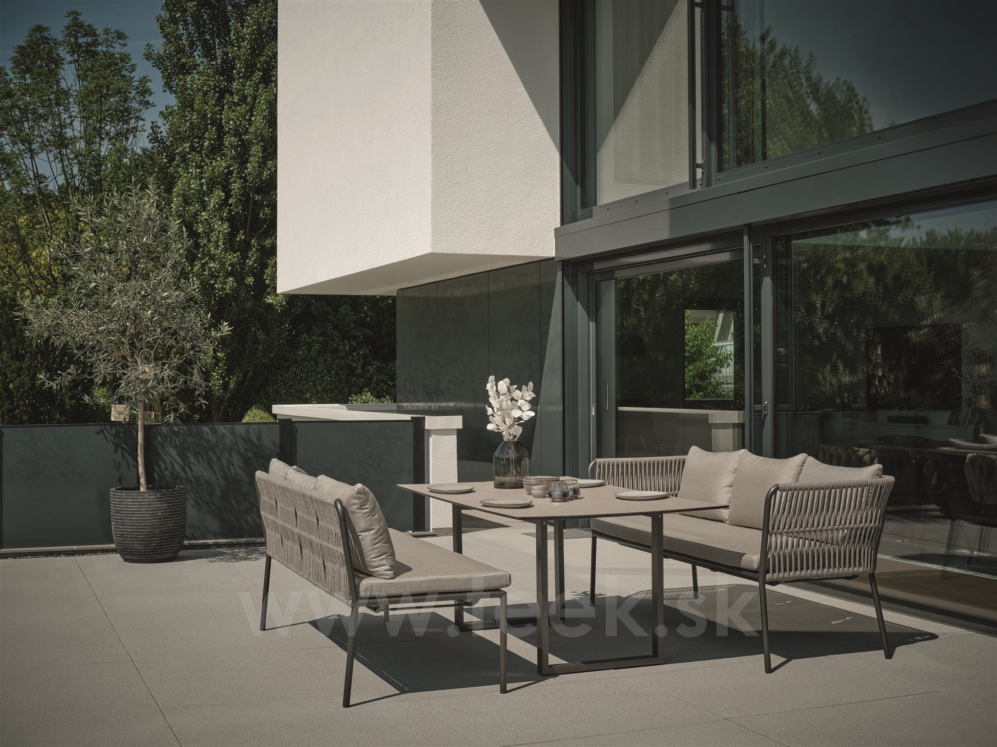 Vzdušná pohodlná zahradní jídelní křesla a modulární jídelní sestava s lavicemi na terasu nebo na zahradu.