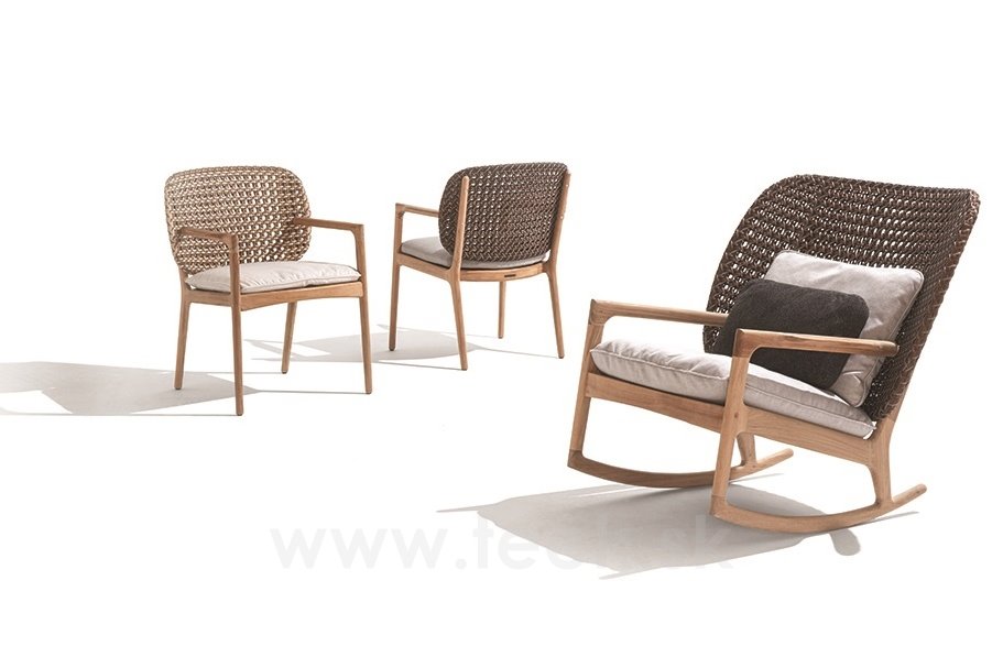 Dizajnová vonkajšia jedálenská stolička z teakového dreva a umelého ratanu.