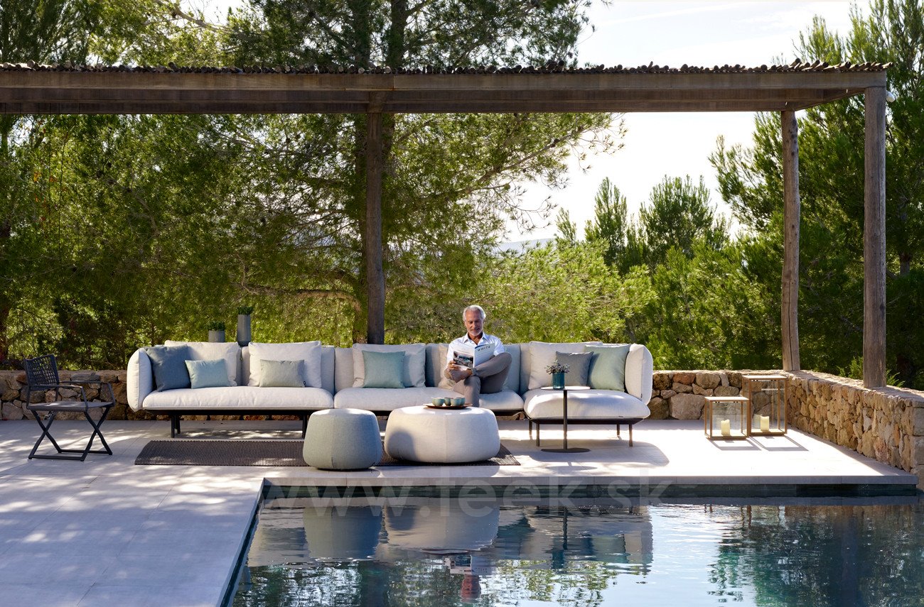 Vonkajšia modulárna sedacia súprava Senja Sofa od spoločnosti Tribu s rámom z lakovaného hliníka.