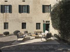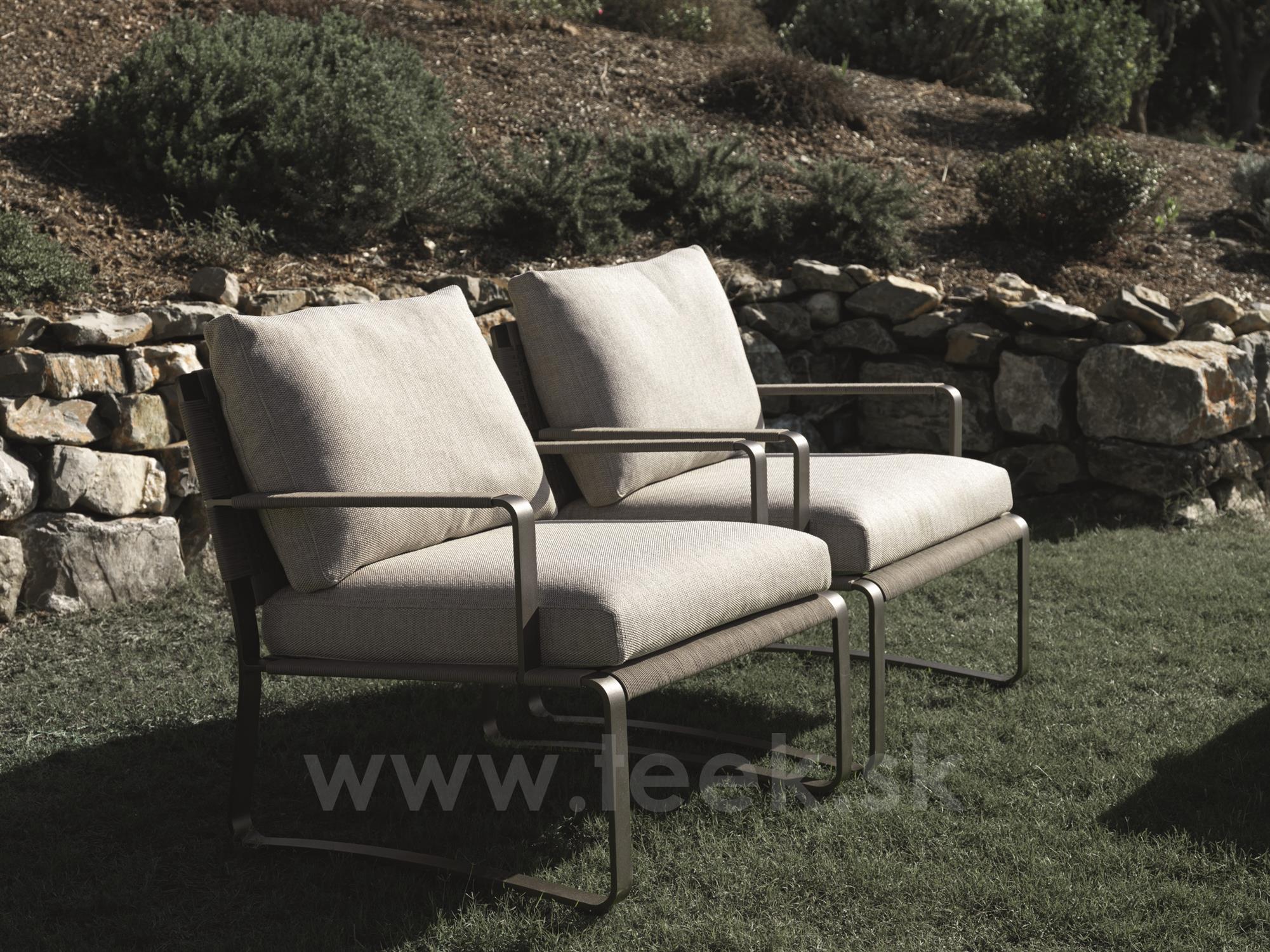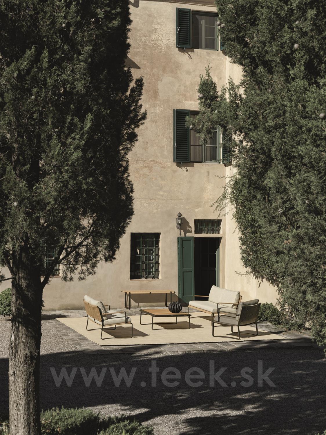 Elegantný vonkajší nábytok s dvojmiestnou pohovkou, priestranným kreslom a konferenčným stolíkom. Lakovaná hliníková konštrukcia s ručne tkaným polypropylénovým čalúnením spája minimalistický dizajn s pohodlím a nadčasovou eleganciou.