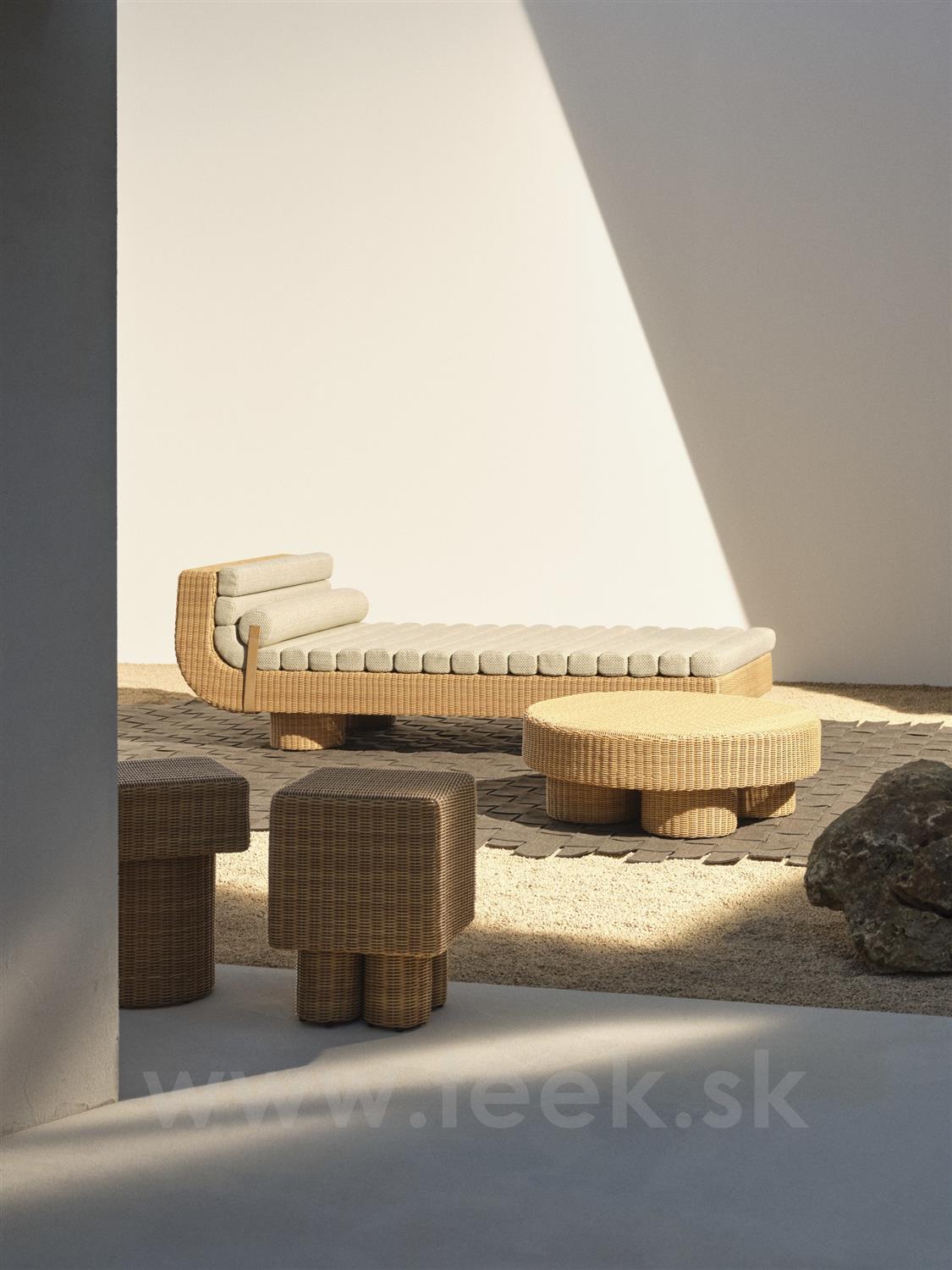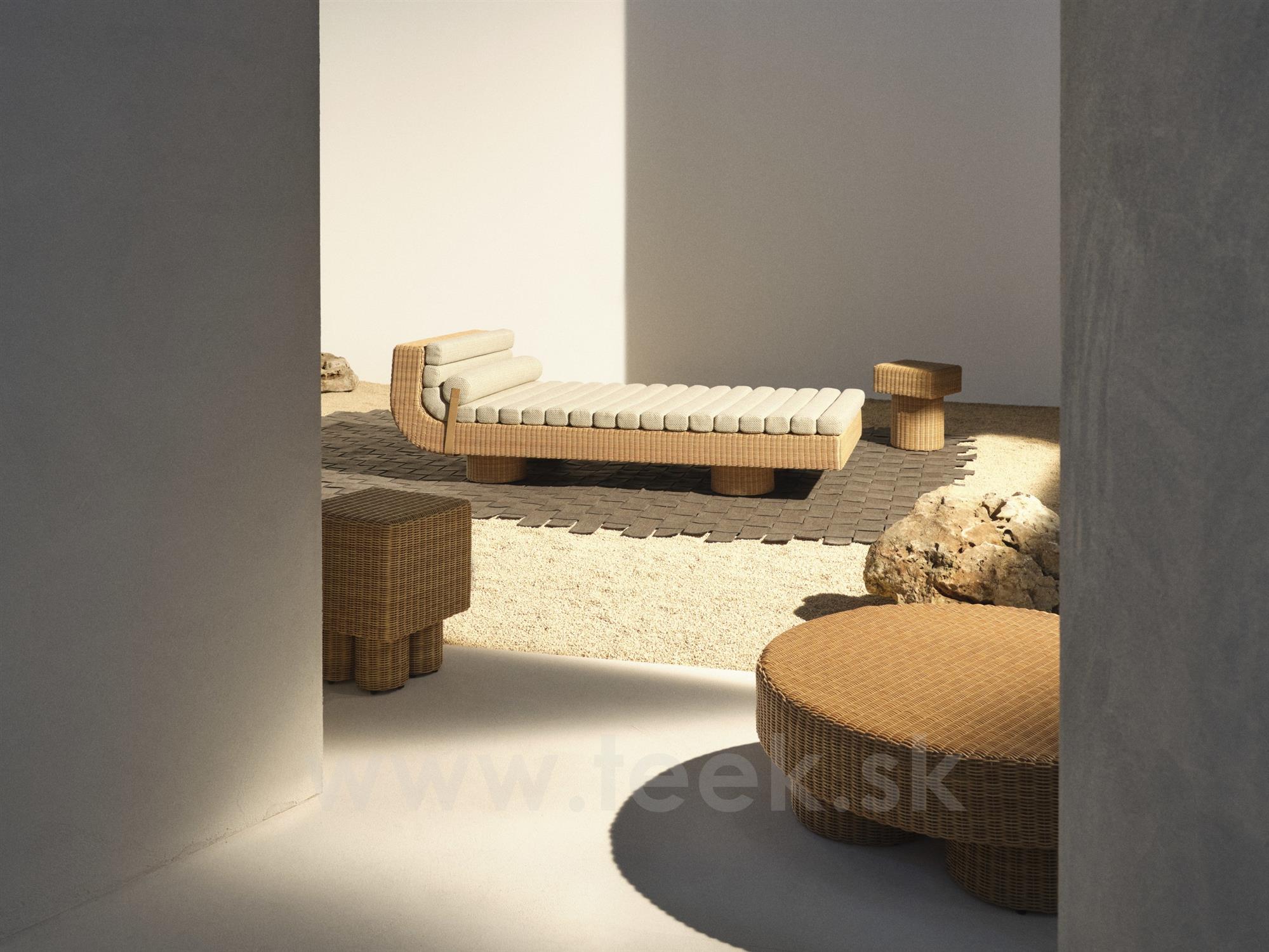 Ležadlo Pantalica od Elisy Ossino kombinuje plynulé krivky s elegantnými líniami a prináša sochársku formu do vonkajších priestorov na odpočinok. Kolekcia je inšpirovaná stredomorskou tradíciou a jej názov je odvodený od slávnej sicílskej lokality Pantalica zapísanej na zozname UNESCO.