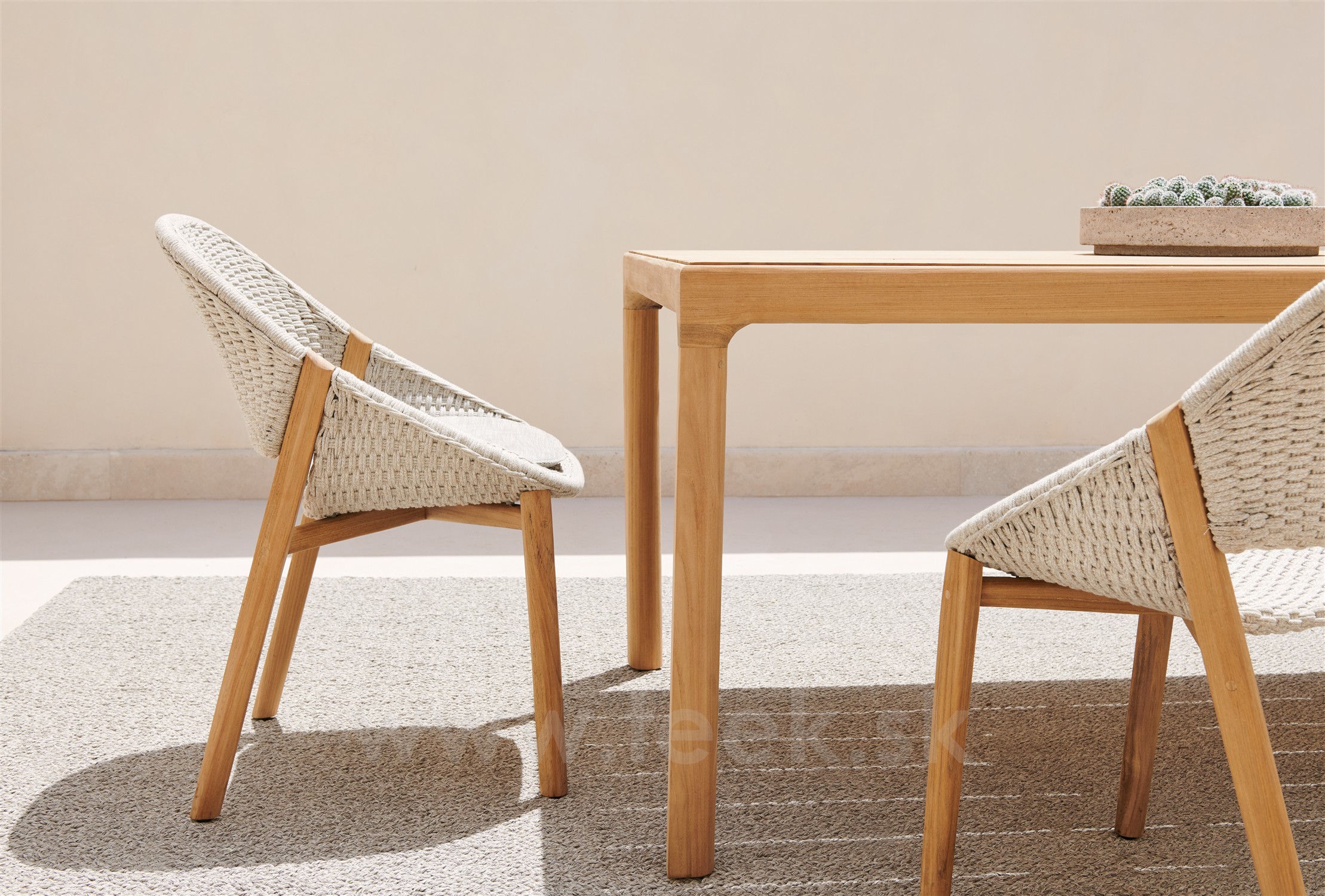 Elegantný teakový jedálenský vonkajší stôl Illum značky Tribu, rám je z teakového dreva, doska z keramiky (farba LINEN). Rozmer: 267x100x76 cm.