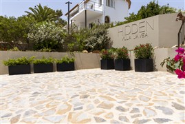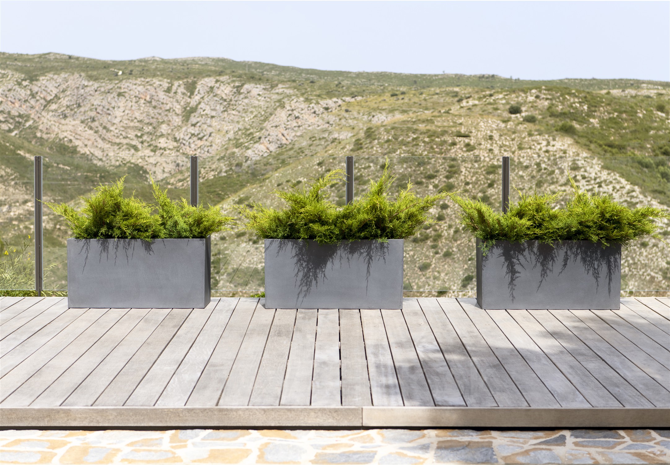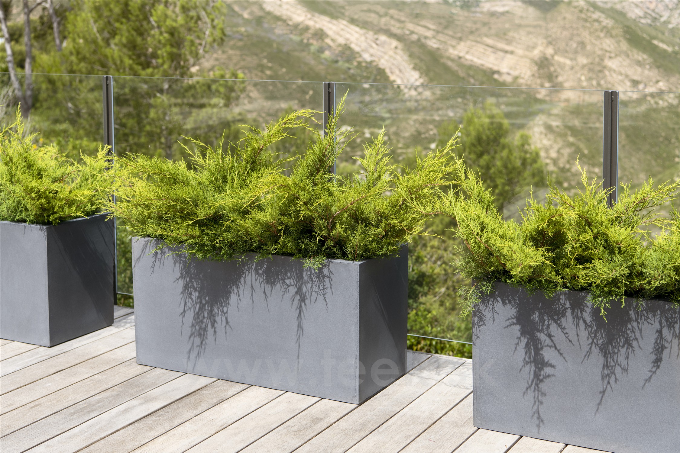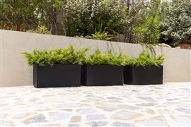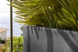 Oblíbené venkovní obdélníkové kompozitní květináče - truhlíky v různých rozměrech.
