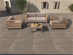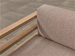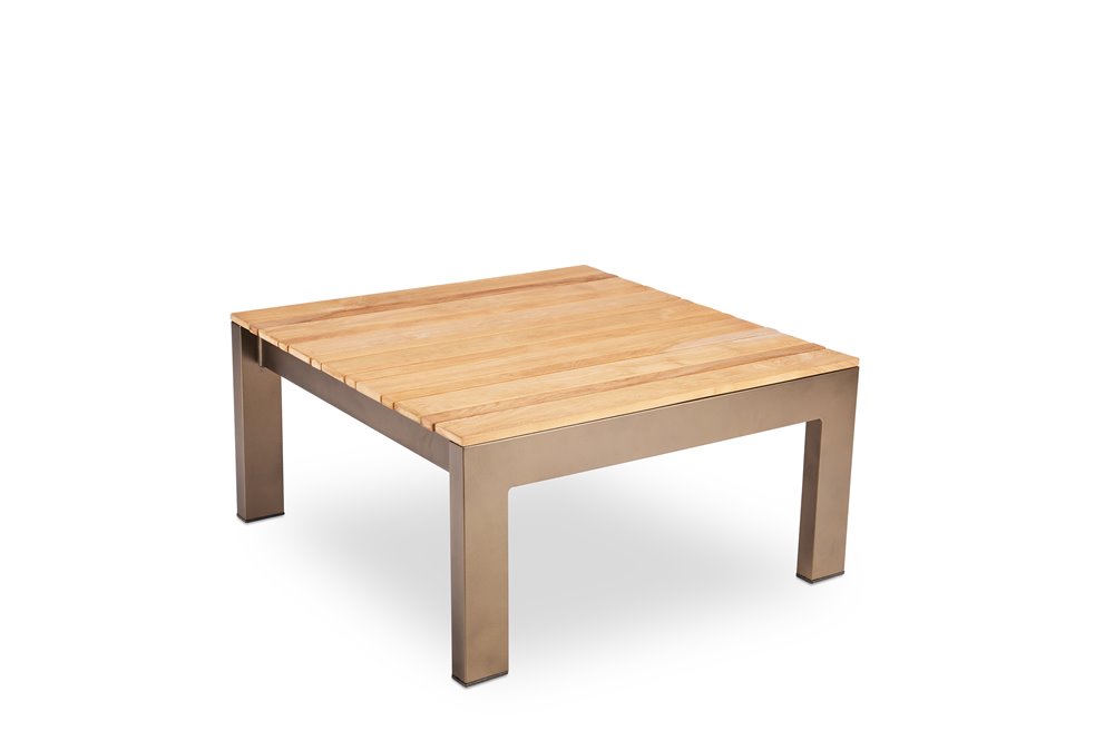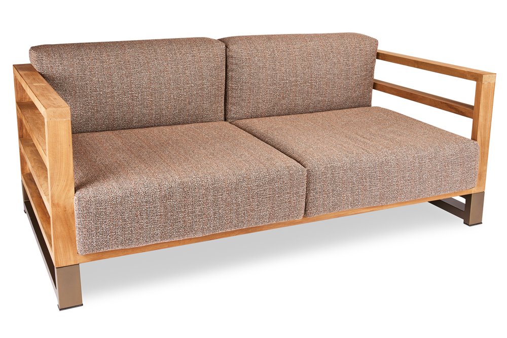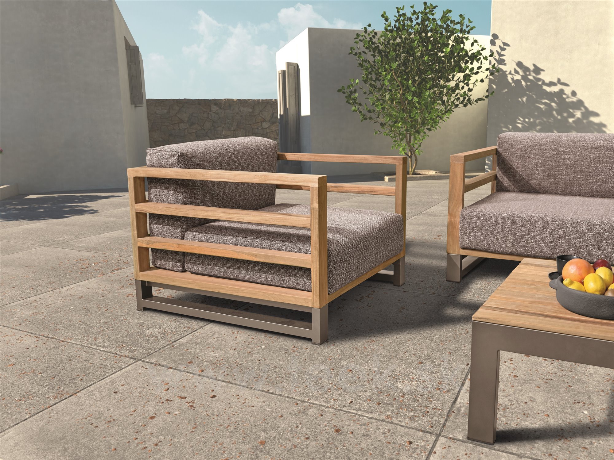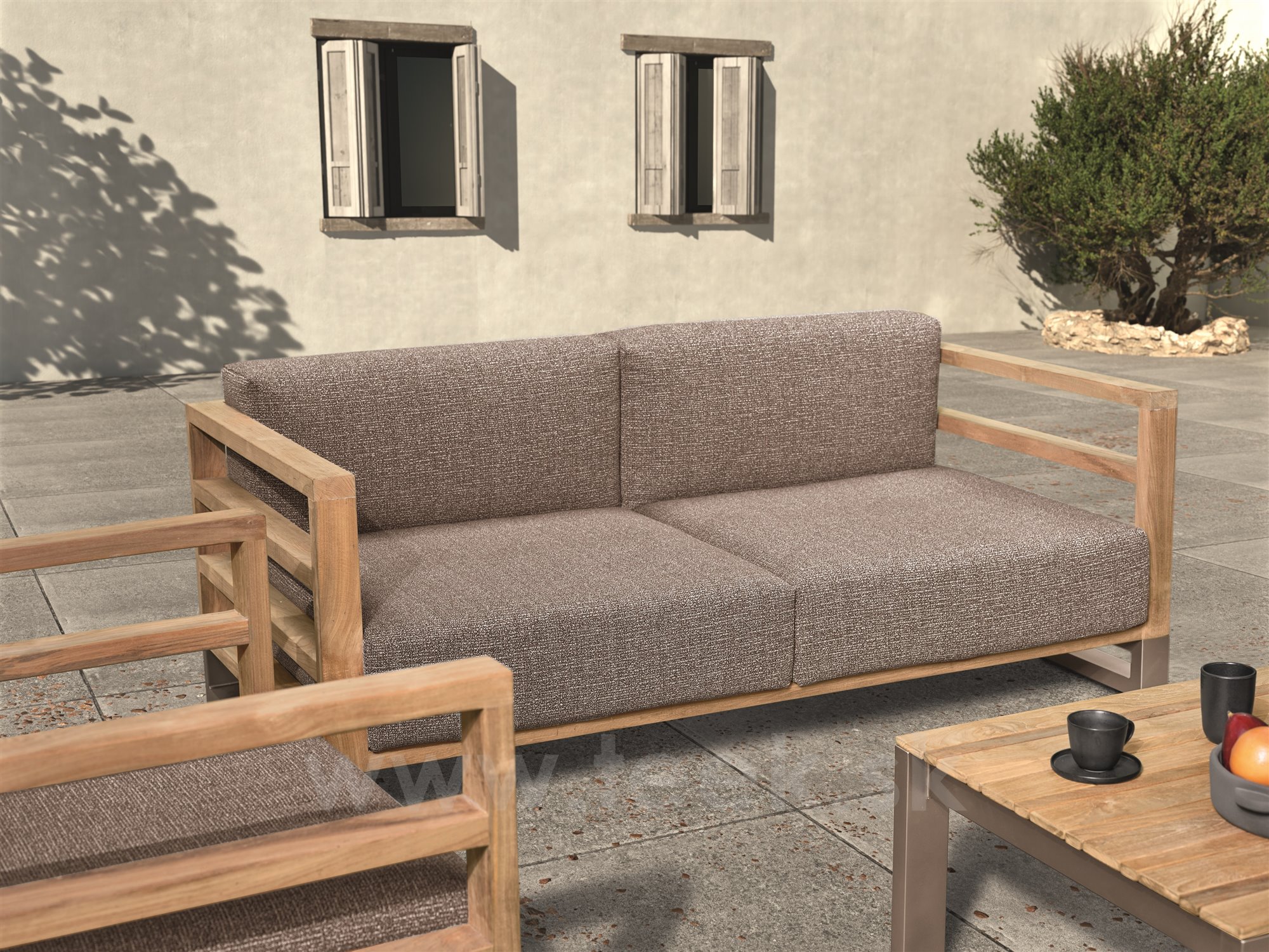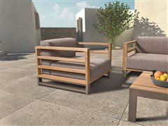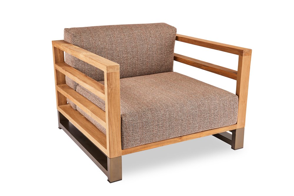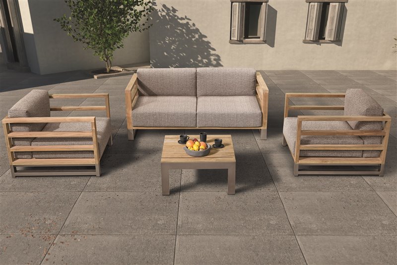 Dizajnová sedacia zostava kombinujúca prírodné teakové drevo a lakovaný hliníkový rám.