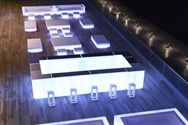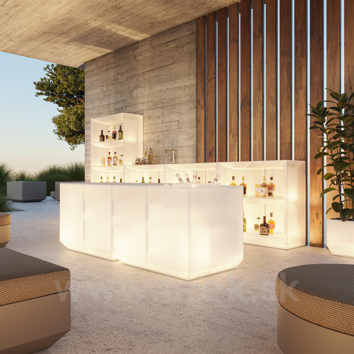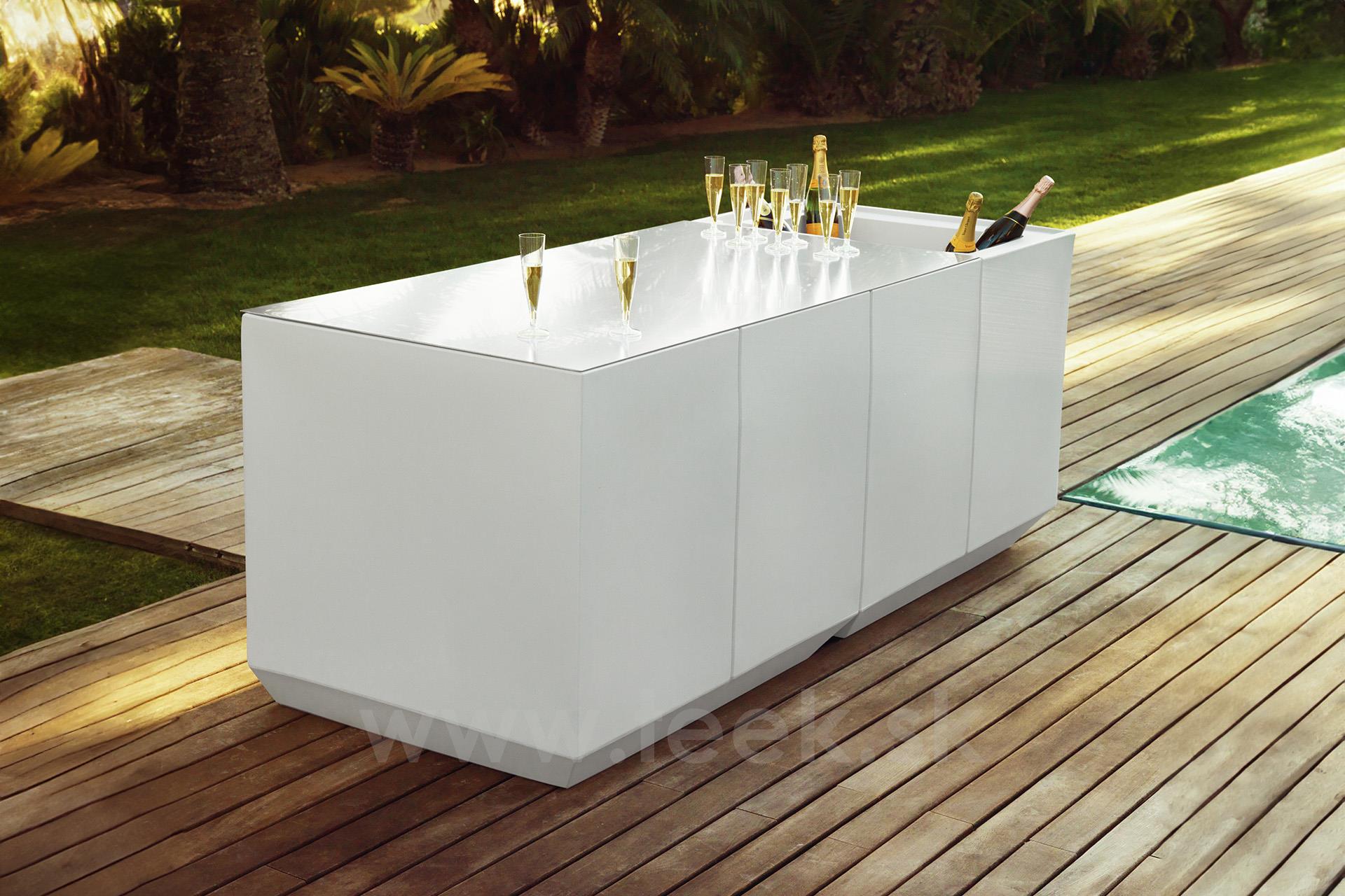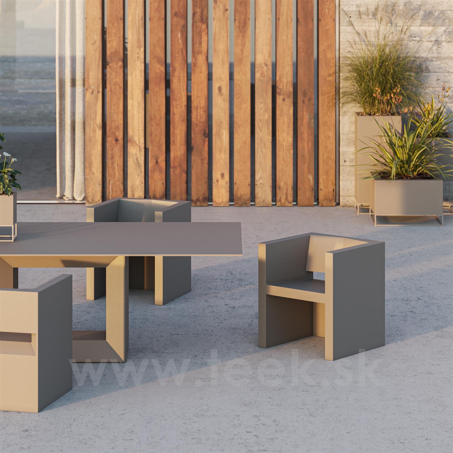 Vonkajšia jedálenská súprava z kolekcie Vela od španielskej značky Vondom. Kolekcia obsahuje aj barový pult a policový systém, ktorý je vhodný pre hotely a reštaurácie.