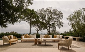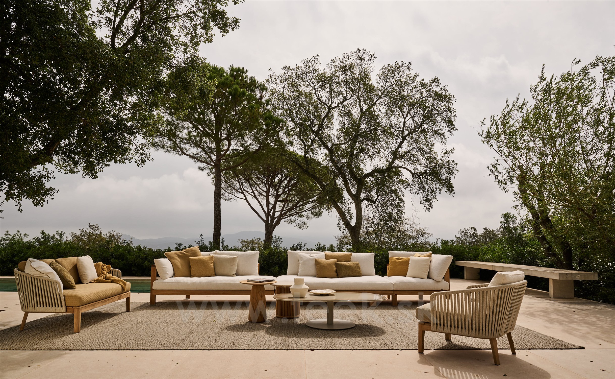 The Mood outdoor 2-seater sofa by Tribu features a refined teak wood frame complemented by a wide rope weave.