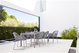 Rám jedálenského kresla je z hliníka. Výplet kresla z umelého ratanu (Cane-line Weave).