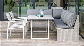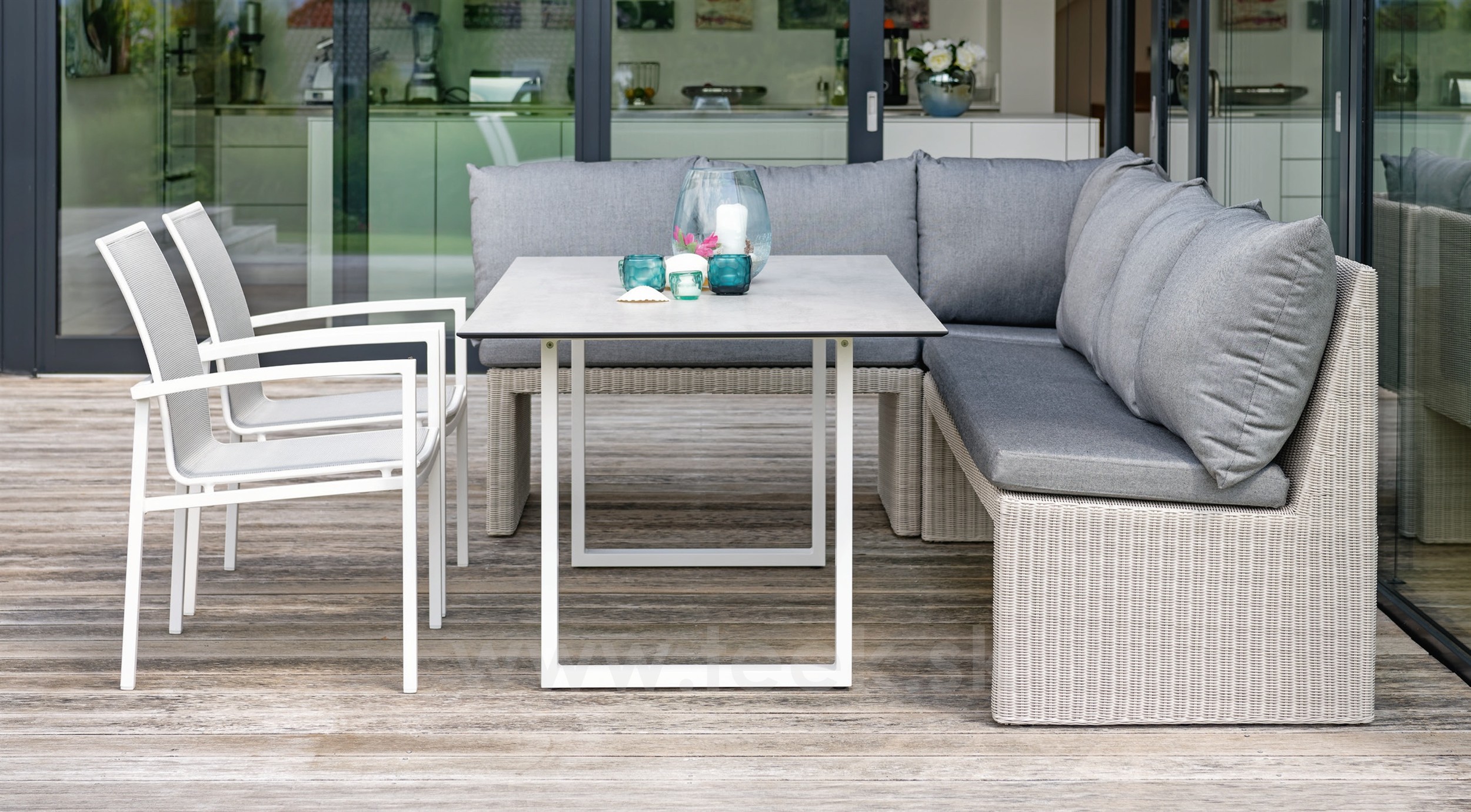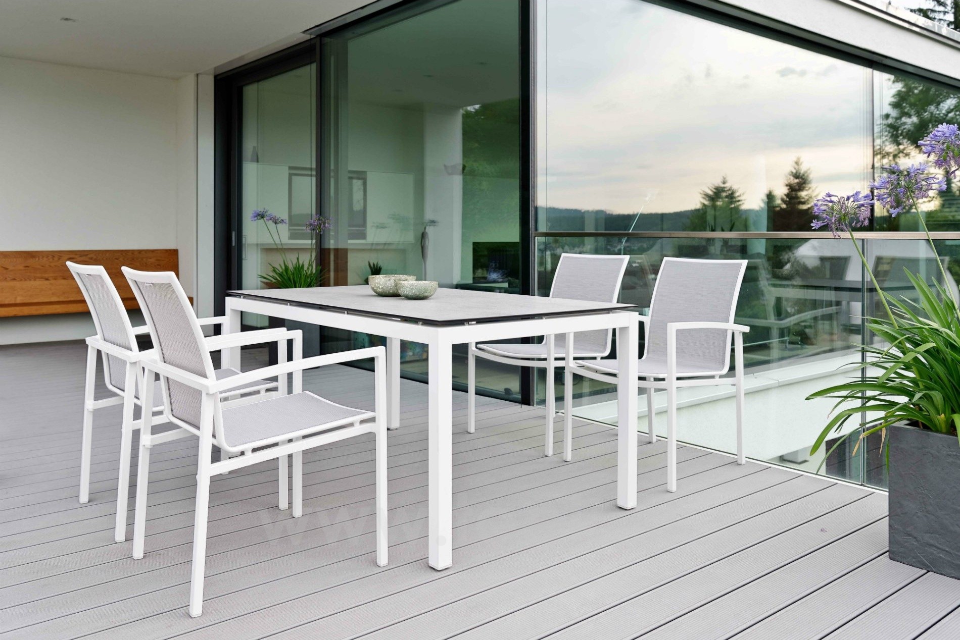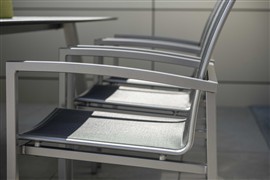 Záhradné jedálenské kreslo Skelby značky Stern má lakovaný hliníkový rám a výplet z pružného textilénu.