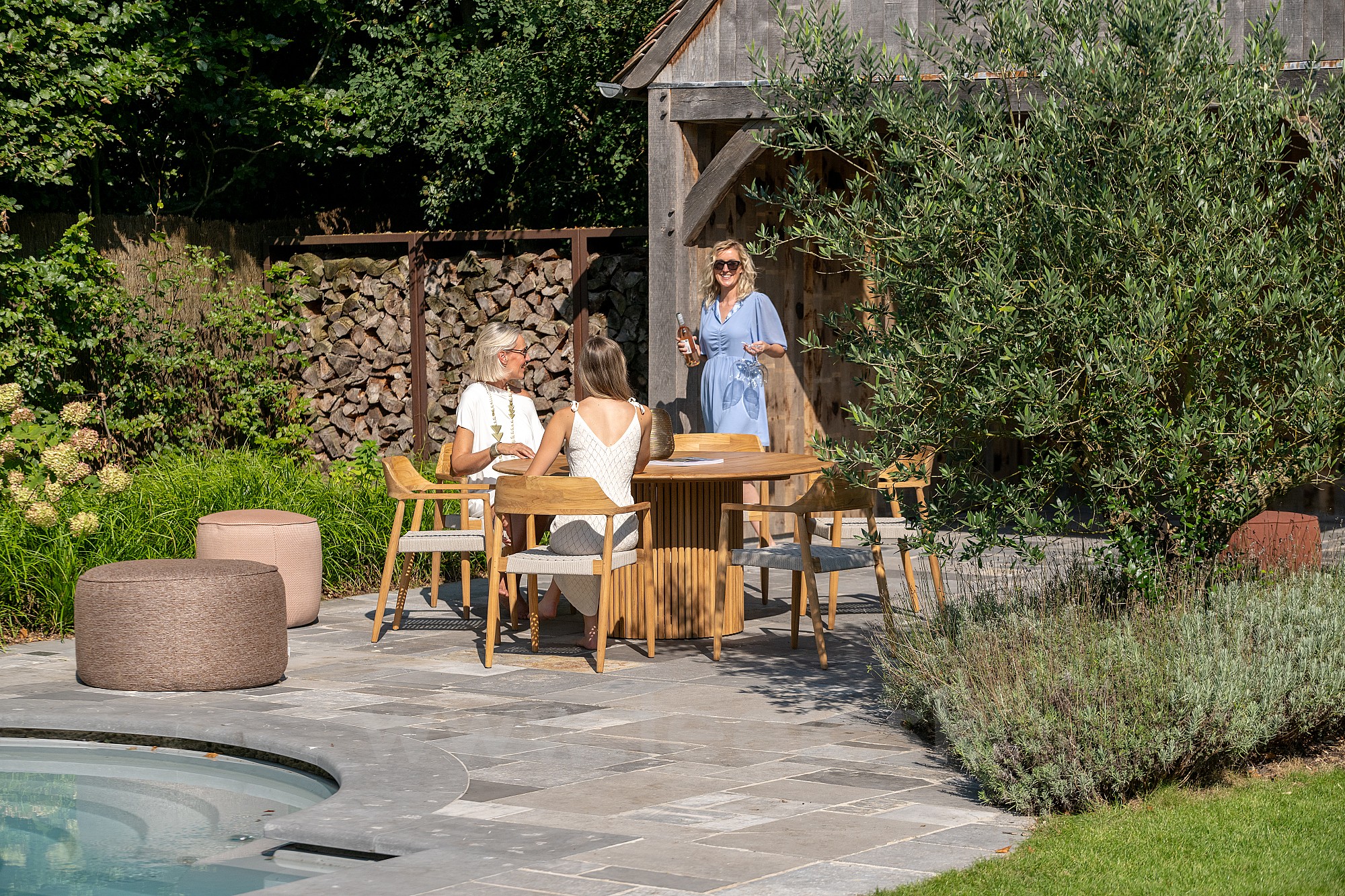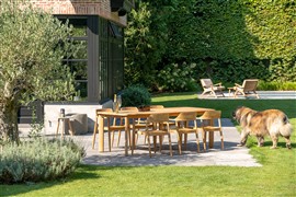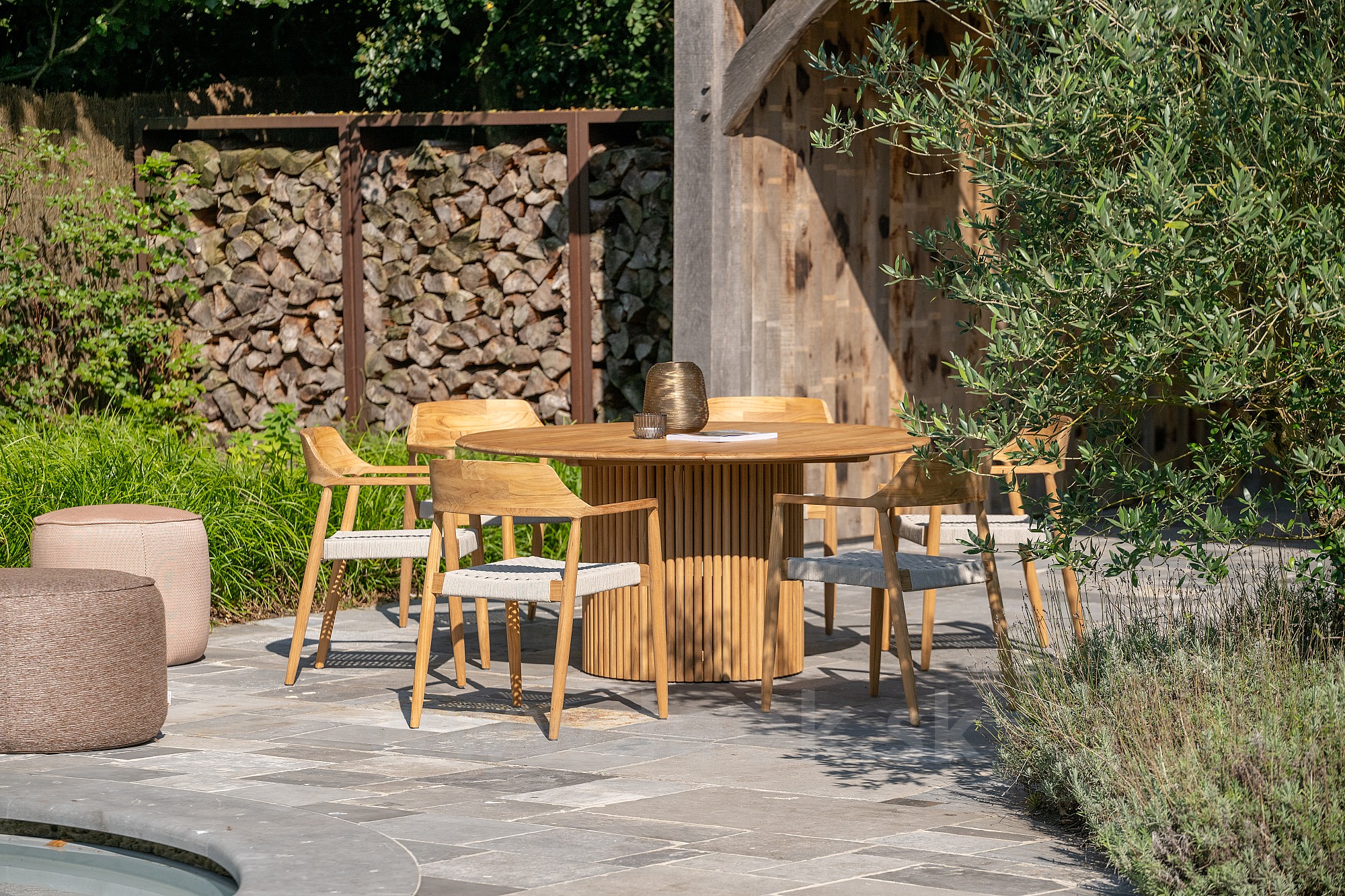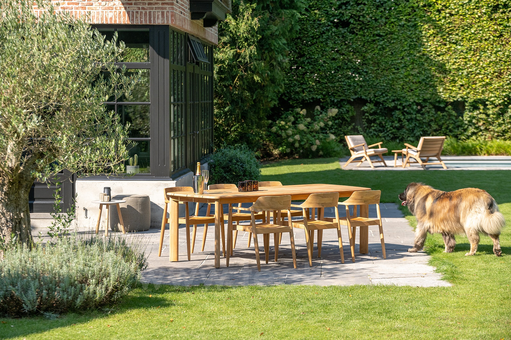 Teakové jedálenské kreslo z kolekcie Tofino Teak od belgickej značky Jati Kebon. V ponuke je buď v celoteakovej verzii alebo vo verzii so sedákom vypletaným lankom.