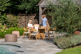 Vankúšik na opierku pre jedálenské kreslo Tofino Teak, Jati Kebon, vonkajšia látka Suntessa Marshall Bric Rust