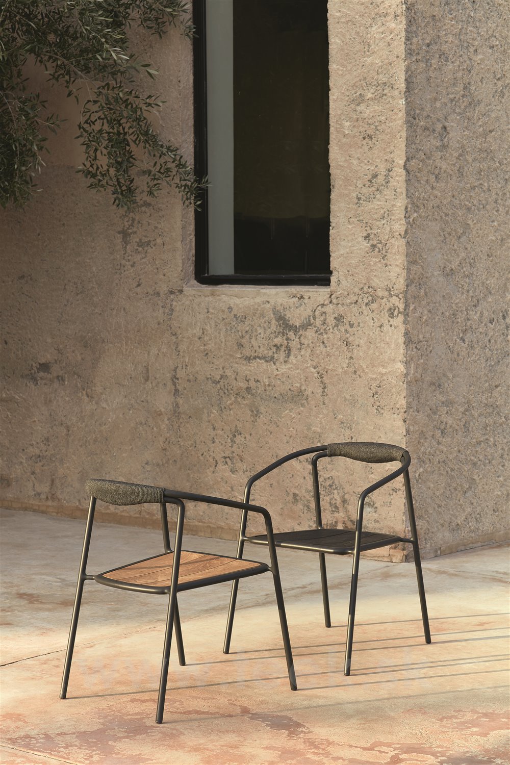 Jedálenské záhradné kreslo Duo značky Manutti. Jedálenské kreslo má lakovaný hliníkový rám a sedák z teakového masívneho dreva. Operadlo je opletené lankovým výpletom. Jedálenské kreslo je stohovateľné.