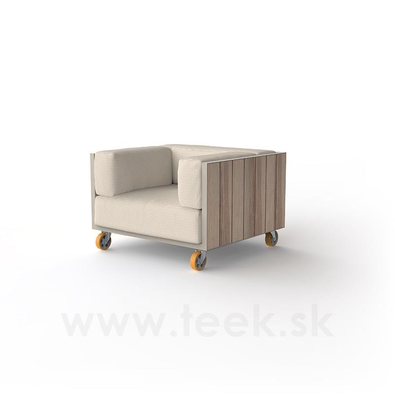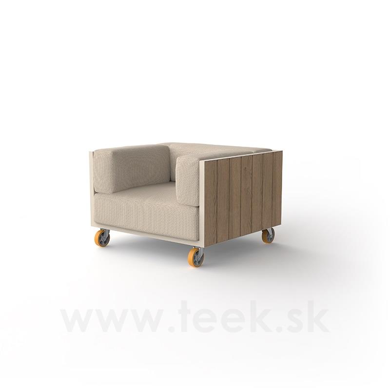 Nízke kreslo na kolieskach Vineyard, Vondom, 107x94x71 cm, lakovaný hliník, teakové drevo, podušky na sedenie z vonkajšej tkaniny skupiny 1A a 1B, farba podľa vzorkovníka