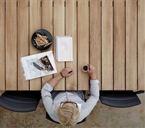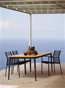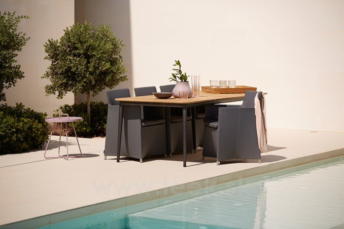 Hliníkový záhradný jedálenský stôl kolekcie Core značky Cane-line. Rám je z hliníka. Doska stola je z teakového dreva.