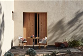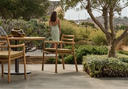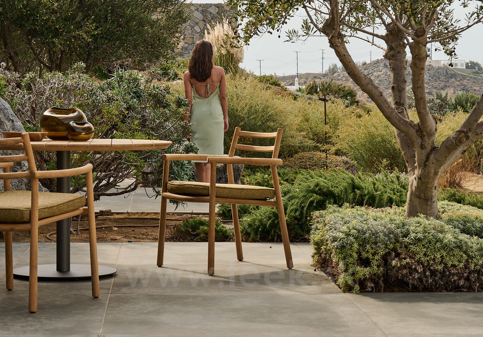 Jedálenský vonkajší stôl T-Table značky Tribu s rámom z lakovanej nehrdzavejúcej ocele a s doskou stola z teaku.
