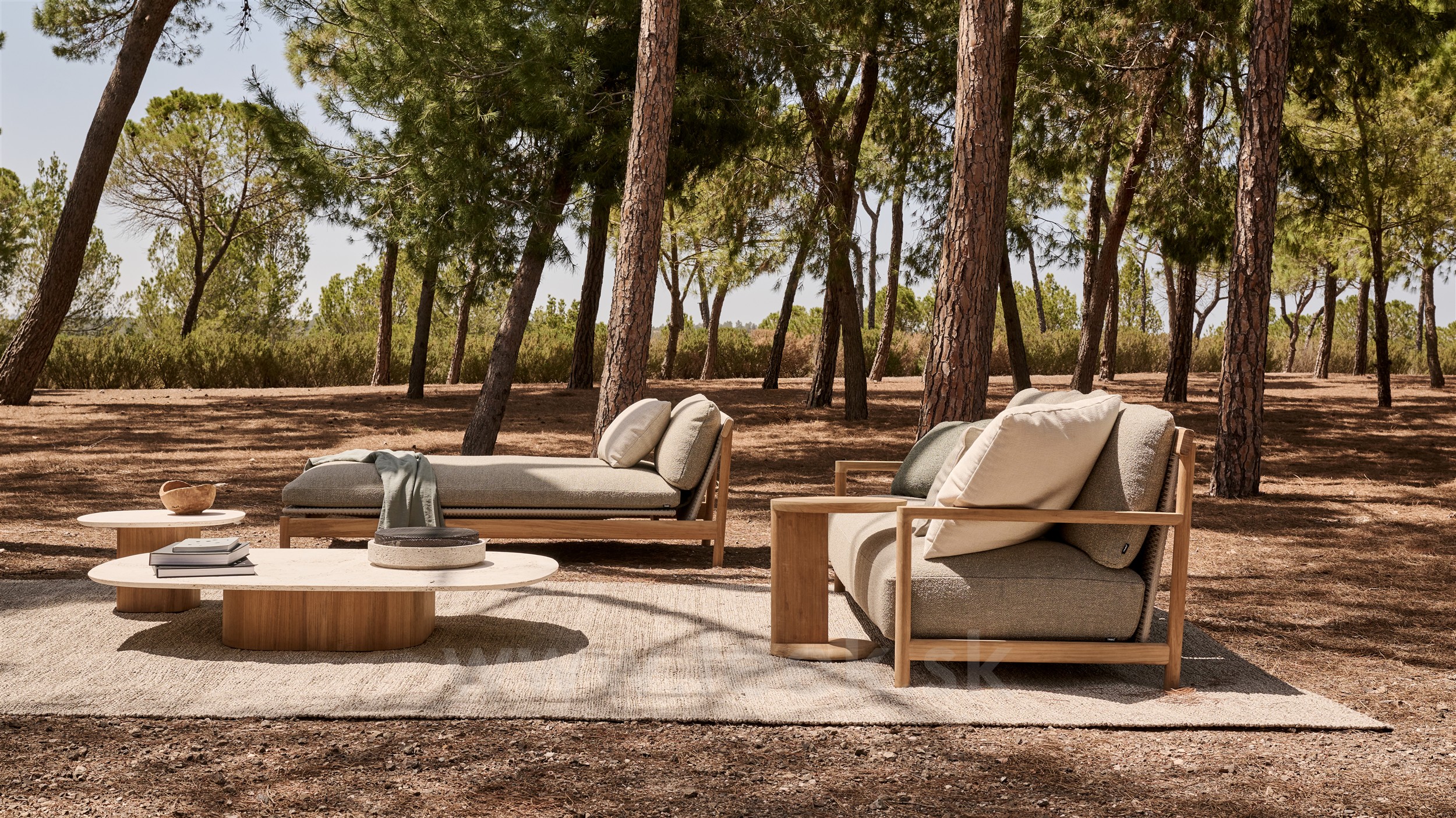 The Seren outdoor coffee table pairs a finely crafted teak base with a ceramic tabletop, offering a refined balance of natural warmth and contemporary elegance.