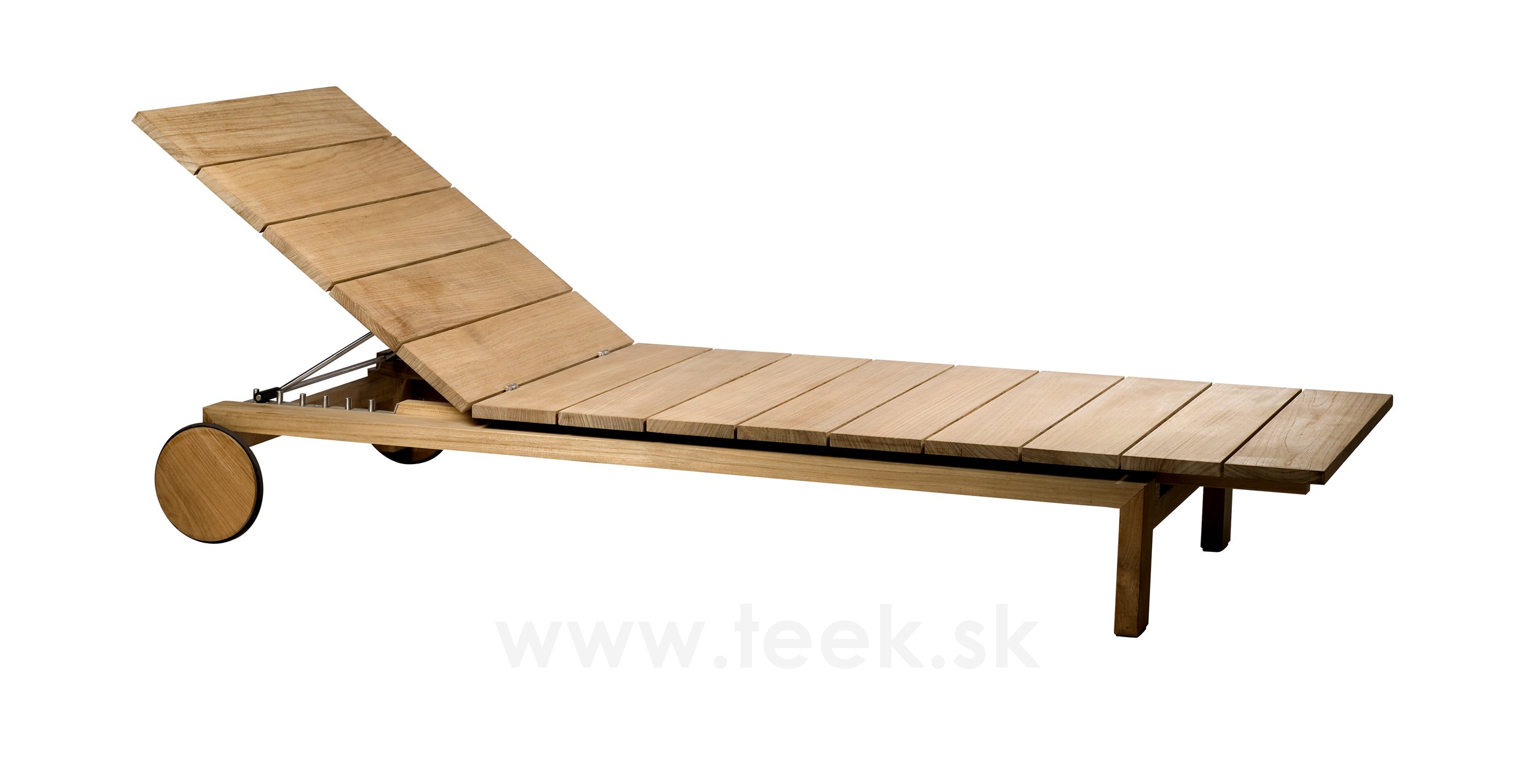 Tribu's Kos Teak exteriérové ležadlo s kolieskami vyrobené z masívneho teakového dreva. Opierka chrbta je nastaviteľná, ležadlo obsahuje veľké kolieska. Pre väčšie pohodlie odporúčame objednať celopotiahnutú vonkajšiu odolnú látku s rýchloschnúcou penovou výplňou.